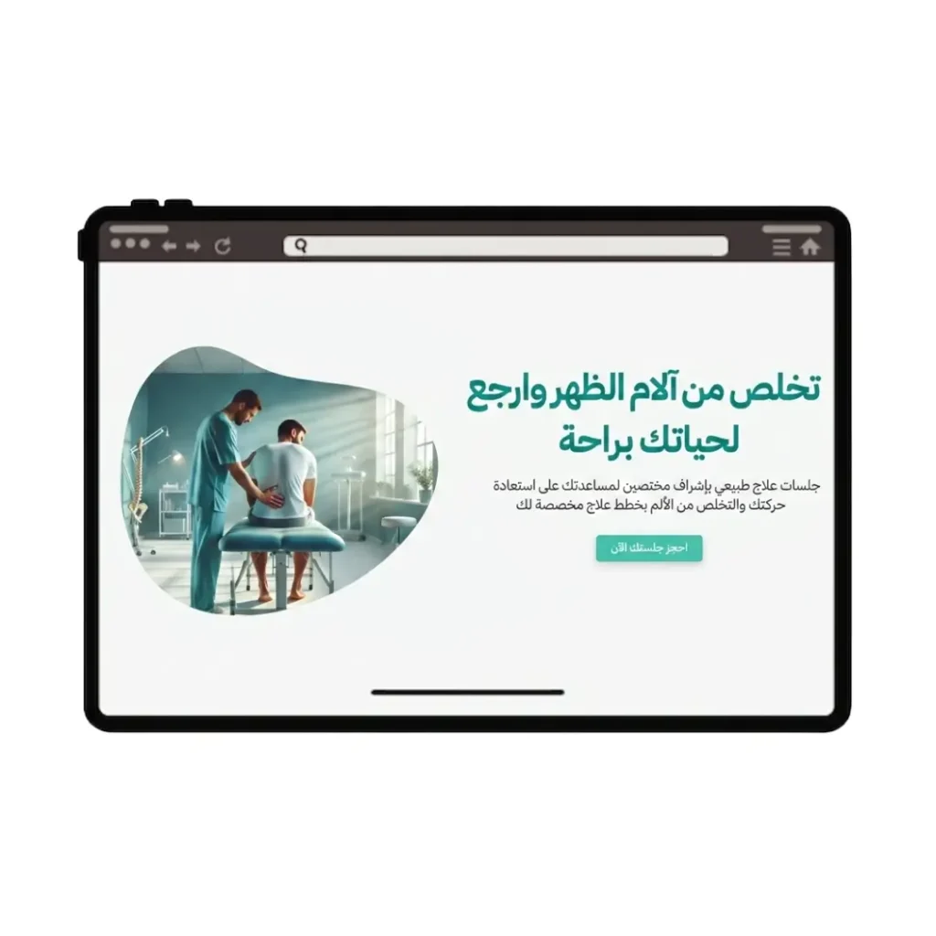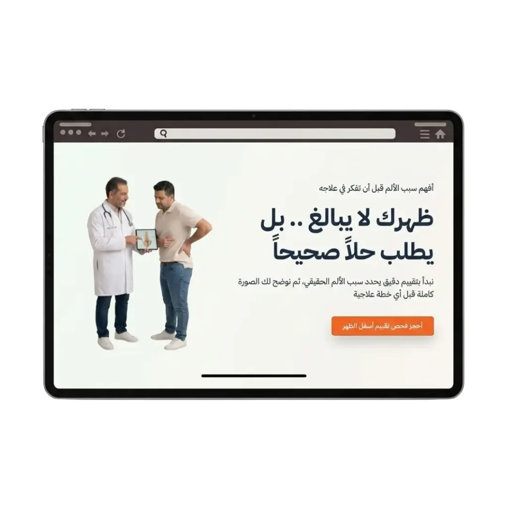 صفحة مصممة لرفع نسبة الحجوزات عبر مخاطبة ألم الظهر والمفاصل بشكل مباشر مع هيكلة تقود الزائر من الإحساس بالمشكلة الى اتخاذ قرار الحجز وهو فاهم حالته ومستعد يبدأ الحل .