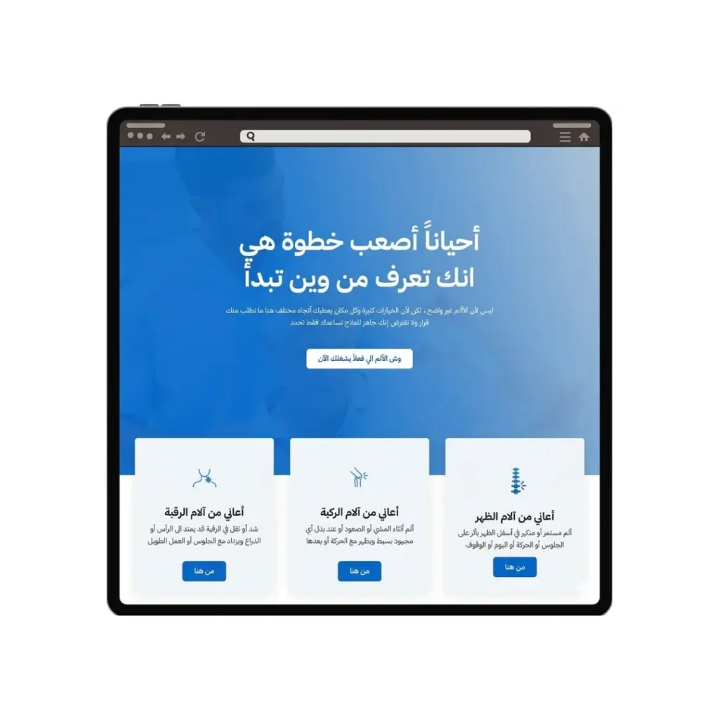 تصميم يعتمد على تقسيم وفلترة الزوار حسب نوع الألم لتقليل التشتت وتوجيه كل حالة لصفحة مخصصة لها مما يرفع جودة العملاء ويزيد من احتمالية اتمام الحجز